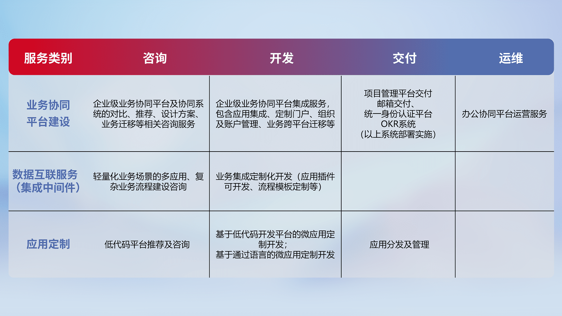 针对钉钉、、企微、、IDaas等平台级产品提供产品的规划、、、、方案、、交付、、、、定制化开发等服务,,,,实现如统一协同办公、、、、智能客户服务、、混合会议管理、、、智能数据查询、、等业务场景,,,,实现数字化转型。。